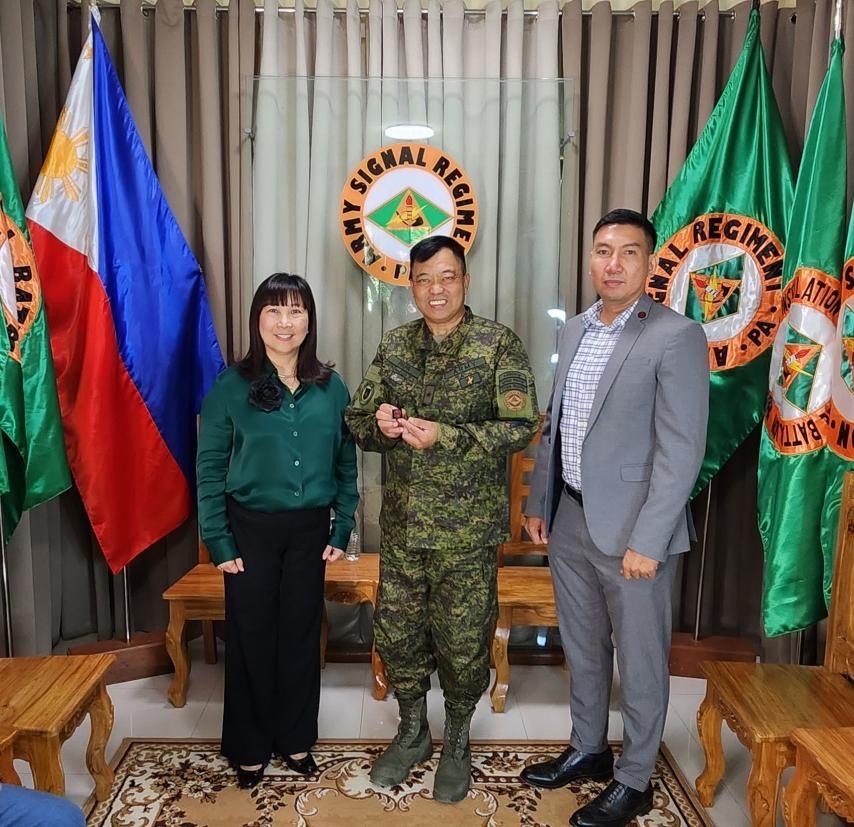 CCSP pioneered a collaborative program with the Philippine Commission on Higher Education (CHED) to advance international cybersecurity through the Defending the Digital National Initiative (DDNI) 12-week hybrid program. Image: Philippine Army Reserve Officers LTC Jan Chavez-Arceo and 1LT Amando Pulido, participants in the DDNI program, presented an OCRI badge to Army Signal Regimen Commander BGEN Alejandro Papa, The Philippines, April 2023. Image courtesy of Jan Chavez-Arceo.